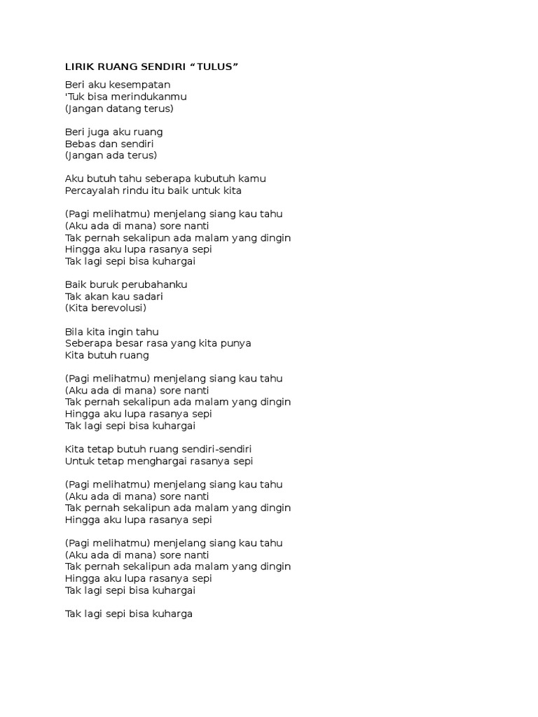 Lagu ruang sendiri adalah album monokrom yang dirilis tahun 2019. ★ download mp3 lagu ruang sendiri tulus gratis, ada 20 daftar lagu sia yang bisa anda download. Beri aku kesempatan tuk bisa merindukanmu jangan datang terus beri juga aku ruang bebas dan sendiri jangan ada terus aku butuh tahu seberapa kubutuhkanmu percayalah rindu itu baik untuk kita. Beri aku kesempatan 'tuk bisa merindukanmu (jangan datang terus) beri juga aku ruang bebas dan send. Download your search result mp3, or mp4 file on your mobile, tablet, or pc.